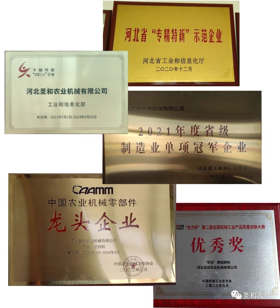 圣和公司為國(guó)家級(jí)專(zhuān)精特新“小巨人”企業(yè)、河北省“專(zhuān)精特新”示范企業(yè),2021年入選河北省民營(yíng)企業(yè)社會(huì)責(zé)任100強(qiáng)企業(yè),河北省工業(yè)和信息化廳頒發(fā)的“2021年度省級(jí)制造業(yè)單項(xiàng)冠軍企業(yè)”。2022年圣和公司入選河北省首批縣域特色產(chǎn)業(yè)集群“領(lǐng)跑者”企業(yè)名單;2022年圣和牌旋耕機(jī)和還田機(jī)全國(guó)銷(xiāo)量第一;2023年中國(guó)機(jī)械工業(yè)聯(lián)合會(huì)第二屆全國(guó)機(jī)械工業(yè)產(chǎn)品質(zhì)量創(chuàng)新大賽圣和牌旋耕機(jī)榮獲“優(yōu)秀獎(jiǎng)”;中國(guó)農(nóng)業(yè)機(jī)械工業(yè)協(xié)會(huì)評(píng)選為2023-2026年度“中國(guó)農(nóng)業(yè)機(jī)械零部件龍頭企業(yè)”。