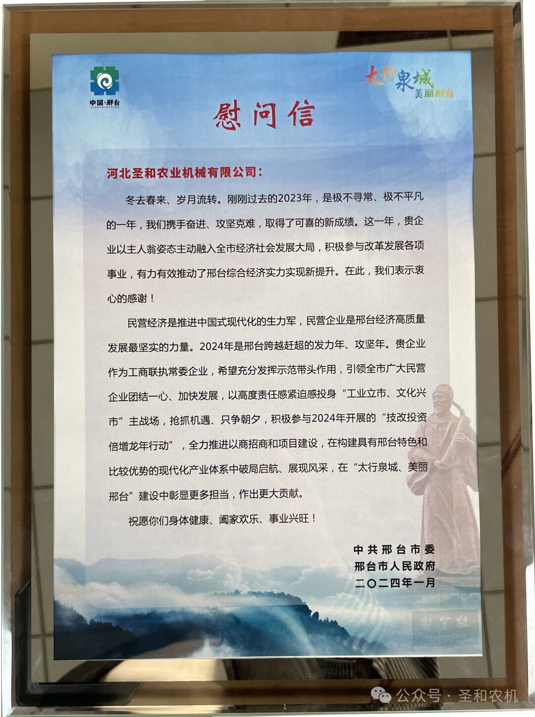 在新春佳節(jié)即將來臨之際,邢臺(tái)市委書記楊猛代表中共邢臺(tái)市委、邢臺(tái)市人民政府,給河北圣和農(nóng)業(yè)機(jī)械有限公司發(fā)來熱情洋溢的《慰問信》,并送上美好的祝福。