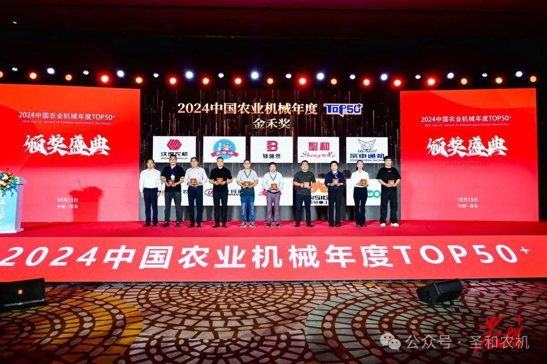 在“2024 中國(guó)農(nóng)業(yè)機(jī)械年度 TOP50+”頒獎(jiǎng)盛典上,圣和品牌再次蟬聯(lián)2024中國(guó)農(nóng)業(yè)機(jī)械年度TOP50+“金禾獎(jiǎng)”。