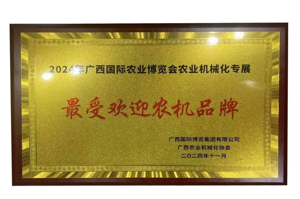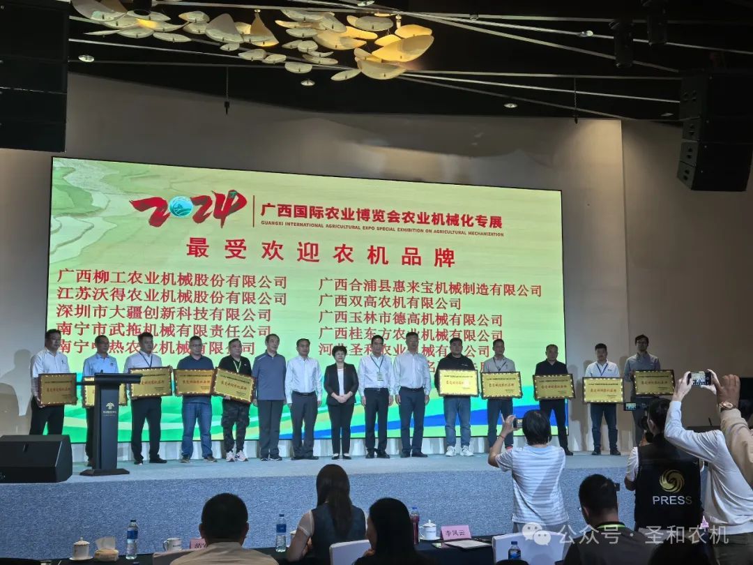 為大力宣傳和推介近年來(lái)在促進(jìn)廣西農(nóng)業(yè)機(jī)械化發(fā)展中受市場(chǎng)認(rèn)可、用戶歡迎的農(nóng)機(jī)企業(yè)(品牌)和產(chǎn)品,營(yíng)造“制好機(jī)、選好機(jī)、用好機(jī)”的農(nóng)機(jī)化良性發(fā)展環(huán)境和社會(huì)氛圍。廣西國(guó)際博覽集團(tuán)有限公司與廣西農(nóng)業(yè)機(jī)械化協(xié)會(huì)自2024年10月就開(kāi)始組織了“2024廣西國(guó)際農(nóng)業(yè)博覽會(huì)農(nóng)業(yè)機(jī)械化專(zhuān)展最受歡迎農(nóng)機(jī)品牌”評(píng)選活動(dòng)。在激烈的評(píng)選競(jìng)爭(zhēng)中,“圣和”品牌不負(fù)眾望,最終斬獲“2024廣西國(guó)際農(nóng)業(yè)博覽會(huì)農(nóng)業(yè)機(jī)械化專(zhuān)展最受歡迎農(nóng)機(jī)品牌”榮譽(yù)稱(chēng)號(hào)。在博覽會(huì)期間,圣和公司申江卓經(jīng)理代表公司出席頒獎(jiǎng)儀式,并上臺(tái)領(lǐng)獎(jiǎng)。
