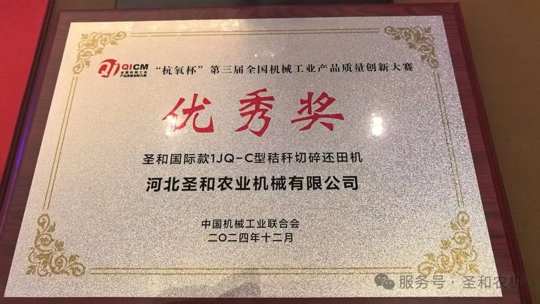 為推進(jìn)實(shí)施質(zhì)量強(qiáng)國戰(zhàn)略,推動機(jī)械工業(yè)高質(zhì)量發(fā)展,由中國機(jī)械工業(yè)聯(lián)合會主辦的“2024年全國機(jī)械工業(yè)高質(zhì)量發(fā)展大會”于12月10日在杭州盛大開幕。從大會同期舉辦的“杭氧杯”第三屆全國機(jī)械工業(yè)產(chǎn)品質(zhì)量創(chuàng)新大賽頒獎活動上喜報傳來,河北圣和農(nóng)業(yè)機(jī)械有限公司的“圣和國際款1JQ-C型秸稈切碎還田機(jī)”在眾多評選項(xiàng)目中脫穎而出,喜獲大賽優(yōu)秀獎。