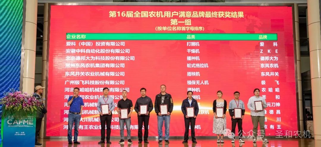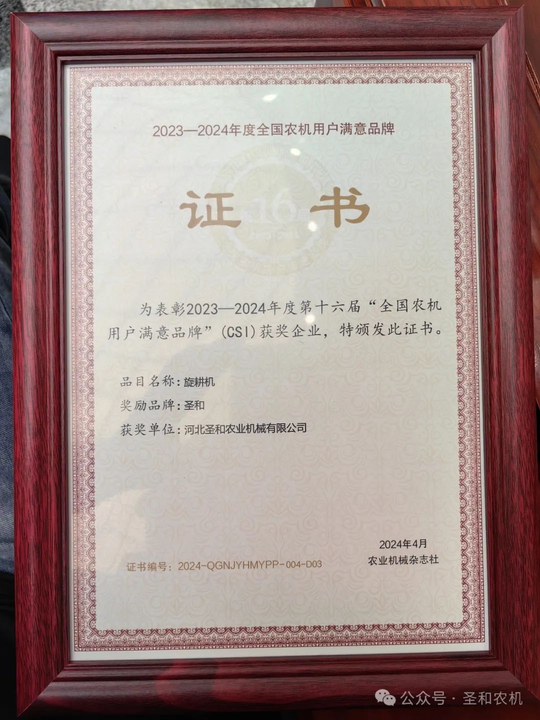 2024年4月27日,“2024 第二屆農(nóng)機(jī)品牌大會(huì)”在浙江永康隆重召開(kāi)。在“2023—2024年度第16屆全國(guó)農(nóng)機(jī)用戶(hù)滿(mǎn)意品牌頒獎(jiǎng)儀式”上,圣和牌旋耕機(jī)再次蟬聯(lián)第十六屆全國(guó)農(nóng)機(jī)用戶(hù)滿(mǎn)意品牌大獎(jiǎng)。