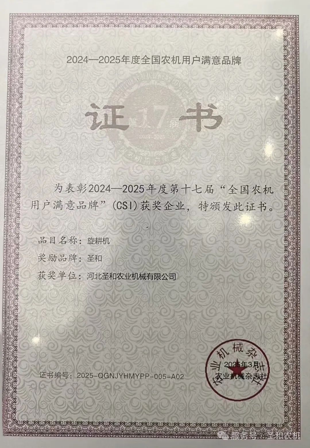 深耕技術革新,筑牢用戶信任根基。作為國內旋耕機行業(yè)的領軍品牌,圣和牌旋耕機始終以“高效、耐用”為核心競爭力。近年來,公司持續(xù)加大研發(fā)投入,致力于為廣大農民朋友提供高效、可靠、節(jié)能的農業(yè)機械產品。其先進的技術、精湛的工藝以及貼心的售后服務,贏得了眾多用戶的信賴和好評。據統(tǒng)計,2024年圣和旋耕機國內市場銷量名列前茅,用戶滿意度連續(xù)5年達98%以上,成為全國農戶的首選品牌。此次獲獎,是對圣和品牌多年來不懈努力和持續(xù)創(chuàng)新的高度認可。