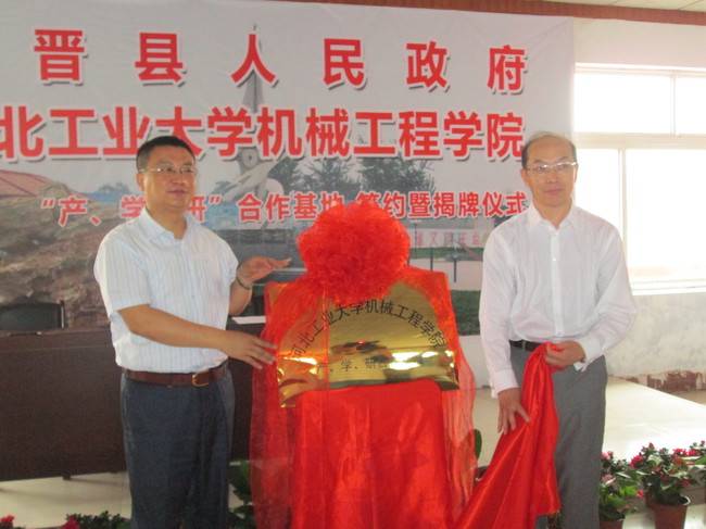 2013年6月8日,河北工業(yè)大學機械工程學院產(chǎn)、學、研合作基地簽約暨揭牌儀式, 學院黨委書記張成德、戴士杰副院長、副縣長攸超、縣工信局白志芬局長、大陸村鎮(zhèn)黨委書計蔡侗江、鎮(zhèn)長宋瑞剛一同出席了揭牌儀式.
