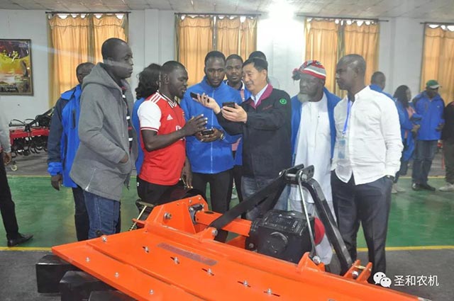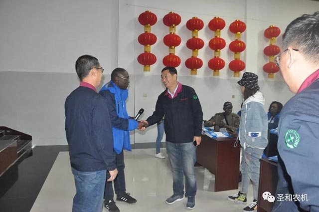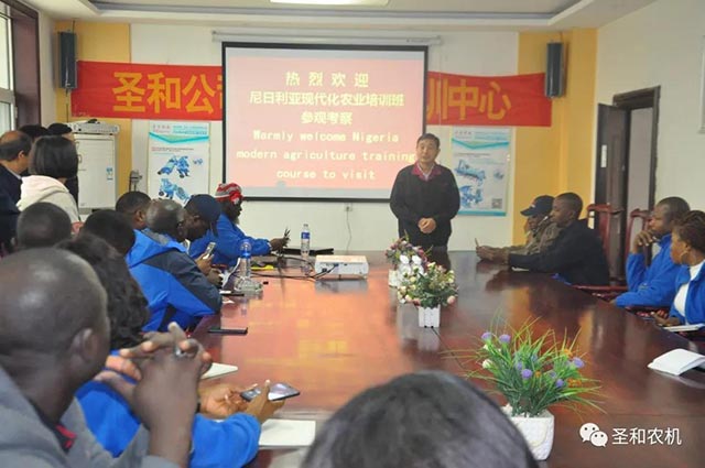 (10月24日)尼日利亞農(nóng)場院及部分政府人員組織現(xiàn)代化農(nóng)業(yè)培訓(xùn)班來河北圣和農(nóng)業(yè)機(jī)械有限公司參觀學(xué)習(xí),公司董事長王新芳、總經(jīng)理師西峰及常務(wù)副總經(jīng)理蘇山嶺帶領(lǐng)團(tuán)隊(duì)熱情接待,并在公司會議室交流探討,公司董事長王新芳致歡迎詞,介紹了企業(yè)概況、發(fā)展理念和發(fā)展目標(biāo),圣和公司正以優(yōu)異的產(chǎn)品邁向現(xiàn)代化、國際化。