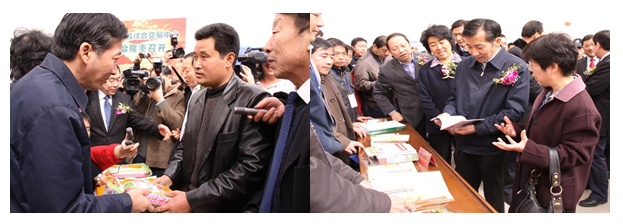 左圖:農(nóng)業(yè)部副部長陳曉華(左一)把放心種子交到種糧農(nóng)民手中