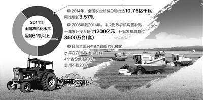 61%的農機化率意味著我國農業(yè)生產方式已實現(xiàn)由人力畜力為主向機械作業(yè)為主的歷史性跨越。2004年底,我國農機化發(fā)展史上第一部法律《農業(yè)機械化促進法》正式實施。此后農機化發(fā)展迎來了黃金十年,中央財政農機購置補貼10年累計投入超過1200億元,補貼農機具超過3500萬臺(套)。農機化水平增幅超過法律實施之前35年的總和,農機工業(yè)總產值從854億元增加到3571億元。